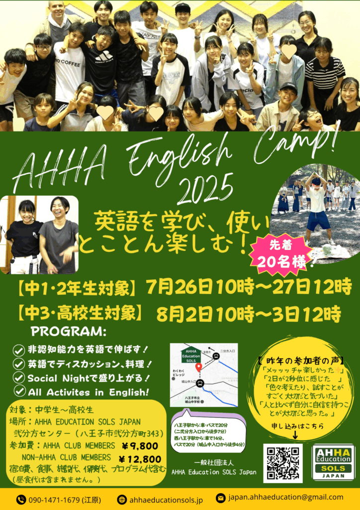 AHHA Camp 2025! 2025年7月4日 最終更新日時 : 2025年7月4日 AHHASOLSJAPAN 昨年、大好評だったAHHA English Campを今年も開催します!お申し込みはこちらから↓ お申込み \ 最新情報をチェック / FacebookXLINECopy